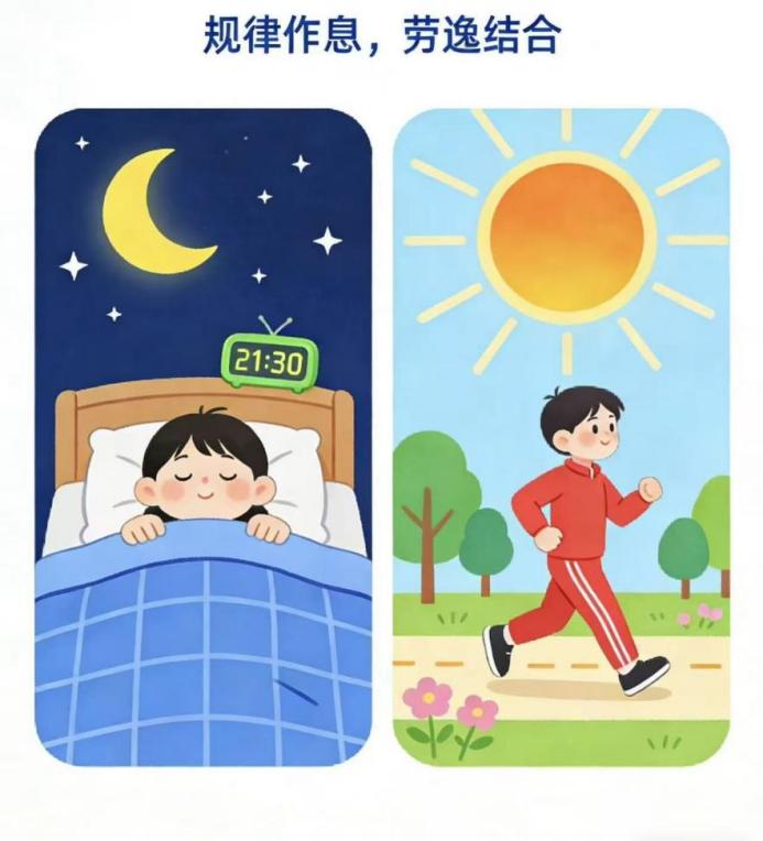 • 作息规律:避免熬夜刷手机、打游戏,保持早睡早起的习惯,合理规划假期训练计划,每天预留固定时间进行慢跑、力量训练、柔韧性练习等,既保持运动状态,又避免过度训练导致受伤,增强体质,远离亚健康。